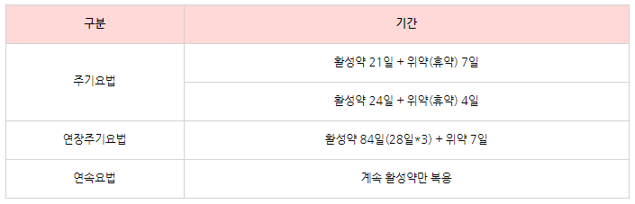 ①주기요법, ②연장주기요법, ③연속요법인데, 휴약기간(즉, 약을 먹지 않거나 혹은 위약을 복용하는 기간)이 며칠인가에 따라 3가지로 나뉘게 됩니다.