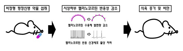 | 좀 더 약학적으로 분석해 본다면, 올란자핀과 같은 비정형 항정신성 약물이 CNS의 시상하부에 멜라노코르틴의 반응성을 감소시켜서 식욕이 크게 증가하게 되는 것으로 인해 살이 찐다고 볼 수 있습니다. 즉, 식욕 억제 신경세포를 억제하여서, 식욕억제 매커니즘이 망가지게 되기 때문이라고 볼 수 있죠. ![]() |