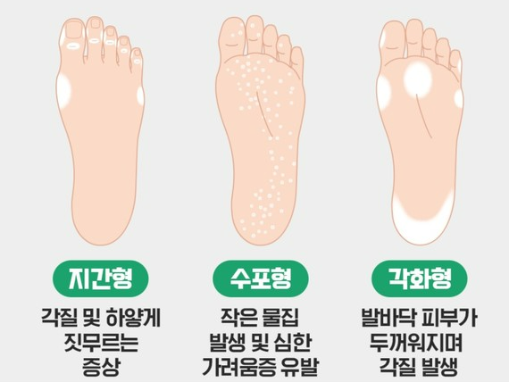 발바닥 무좀은 크게 3가지 종류로 있는데, 지간형, 수포형, 각화형 이렇게 종류가 나뉩니다.