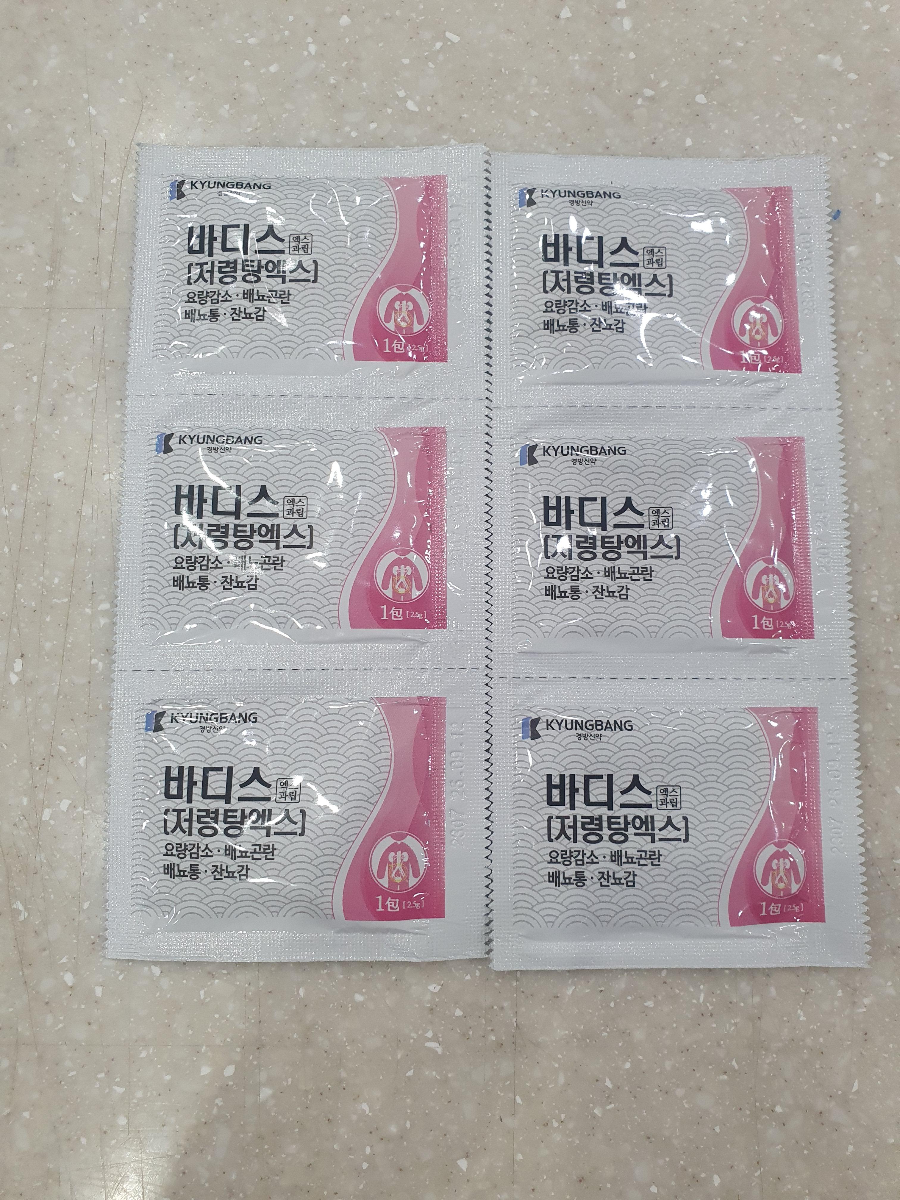 저희 약국에서 다루는 저령탕은 경방신약에서 나온 바디스 엑스과립이라는 상표명을 가진 것으로, 3포(2.5g)에 2,000원에 판매되고 있습니다.