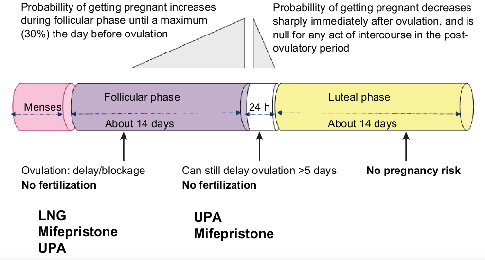 이러한 피임의 원리는 호르몬 조절과 관련이 있는데, 레보노르게스트렐 제제의 경우 LH(황체형성호르몬)이 갑자기 증가하기 전 적어도 2일 전에 복용을 해야합니다.