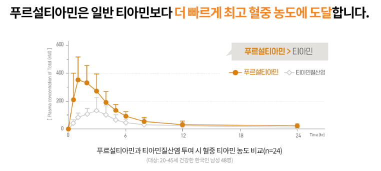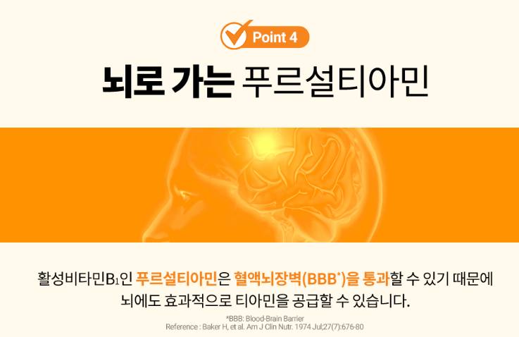 푸르설티아민은 BBB(뇌-혈관 장벽)을 통과하기 때문에 뇌로도 갈 수 있어서, 중추신경계의 항염증, 항산화 효과도 일어납니다. 그런 특징이 있기 때문에, 푸르설티아민으로 각 피로부위와 온몸으로 전달이 빠르게 되어서 효과적으로 피로를 회복할 수 있다고 합니다.